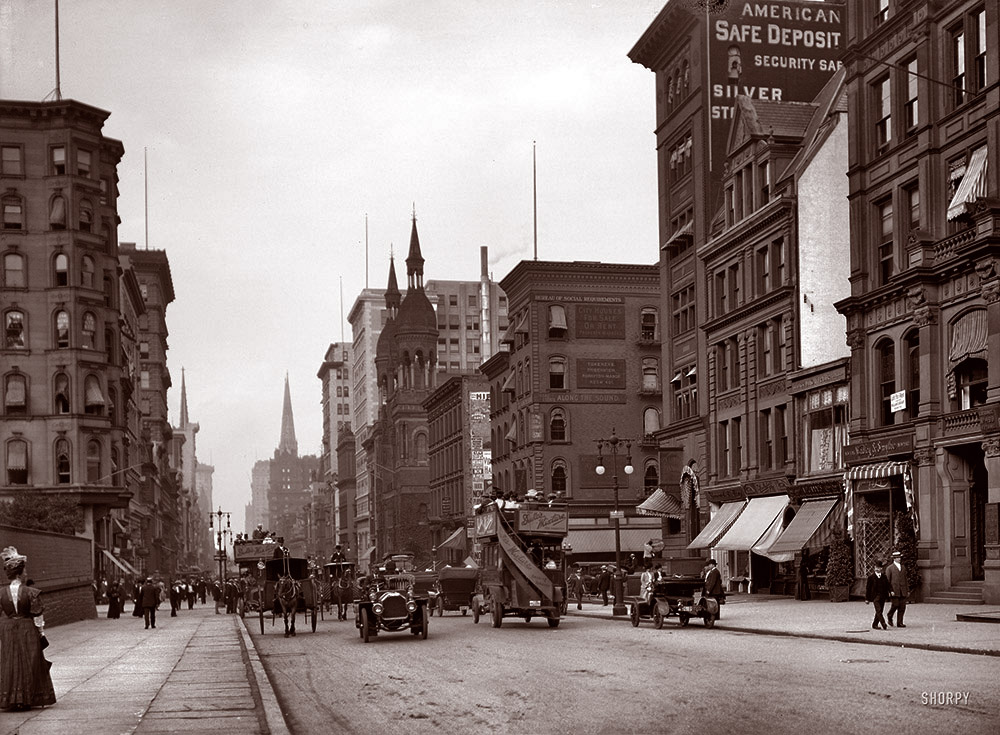 De T-ford komt uit Amerikaen was de eerste auto in massaproductie. De eerste auto's liepen in 1908 van de band en hier in New York 4 jaar later was het gewoon al druk op straat !