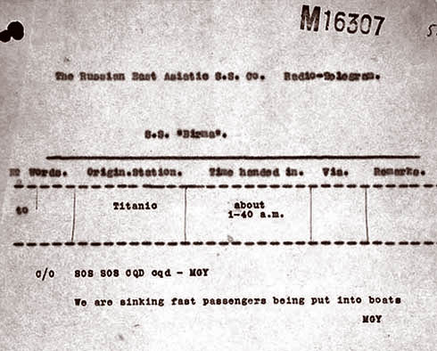 Nadat de omvang van de schade opgenomen was en scheepsbouwkundige Thomas Andrews had geconcludeerd dat het schip zou gaan zinken, gaf kapitein Smith de marconisten John George Phillips en Harold Sidney Bride om 00.15 uur het bevel noodoproepen naar andere schepen te verzenden. Het dichtstbijgelegen schip was de Carpathia, dat binnen vier uur ter plaatse zou kunnen zijn.