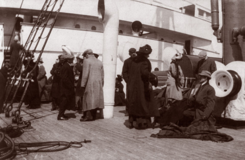 Hieronder de sloepen in de haven bij Pier 54, mee vervoerd door de Capathia die de overlevenden uit zee had gepikt (hierboven) en 'alsnog' afzette in New York.
